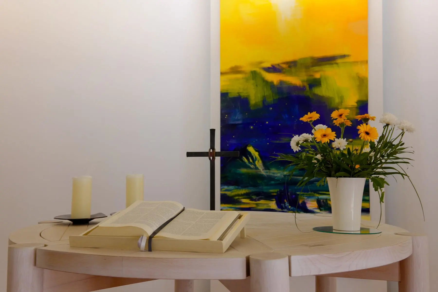 Ein besonderer Blickfang im Gottesdienstraum ist das bodentiefe Bild „Der Himmel für Zornheim“ von Bernd Zimmer – ein Kunstwerk, das den Raum öffnet und zugleich den Blick nach oben lenkt.